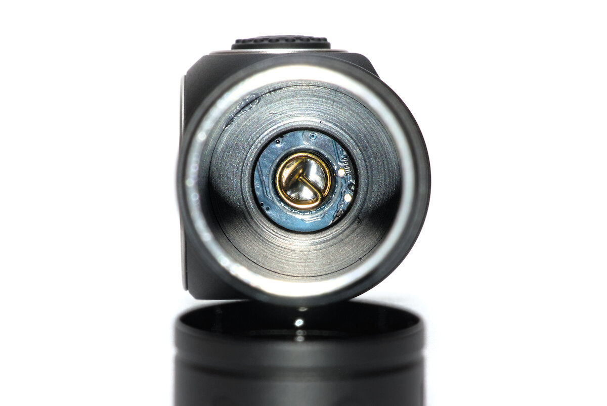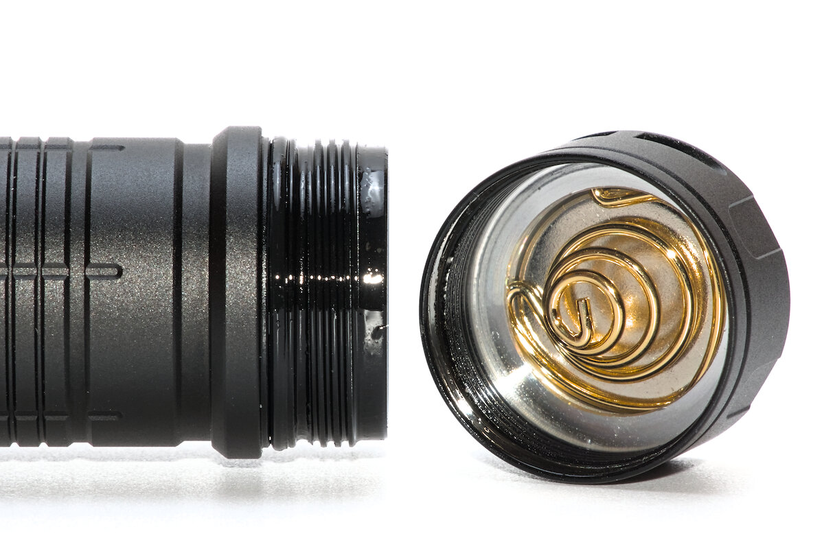 Die Bauteile auf dem Treiber werden durch einen schwarzen Isolator verdeckt, sodass nur noch die Feder zu sehen ist. Kopf und Akkurohr sind miteinander verklebt. Dies ist einerseits eine Vorsichtsmaßnahme des Herstellers, da der Treiber nur durch das Akkurohr in Position gehalten wird. Zum anderen wird dadurch verhindert, dass sich der Kopf versehentlich löst, wenn die Lampe in der Halterung gedreht wird. Erfahrungsgemäß lassen sich die Teile mit ausreichend Kraft voneinander trennen.