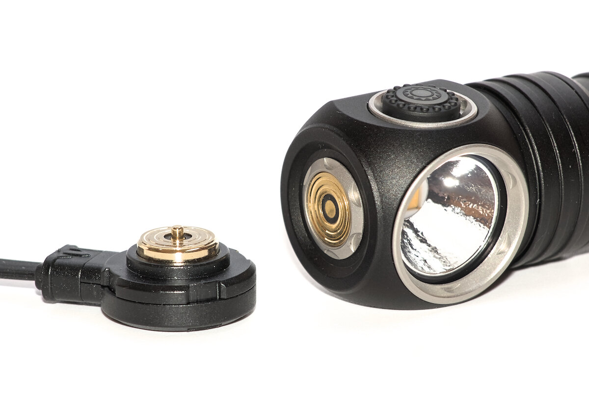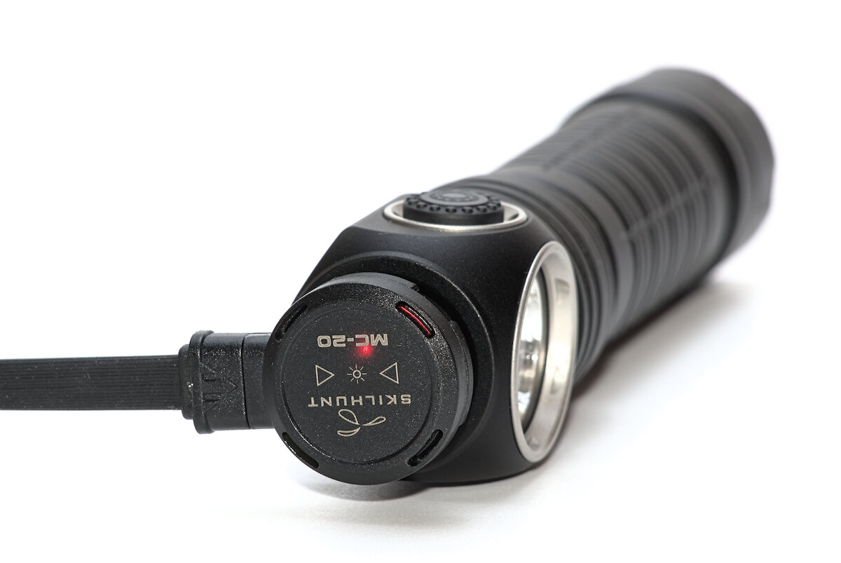 Am Kopf befindet sich ein magnetischer Ladekontakt, über den sich der Akku direkt in der Lampe laden lässt. Dafür wird ein spezieller Ladeadapter („MC-20“) von Skilhunt benötigt, der sich im Lieferumfang befindet, aber auch separat erworben werden kann.