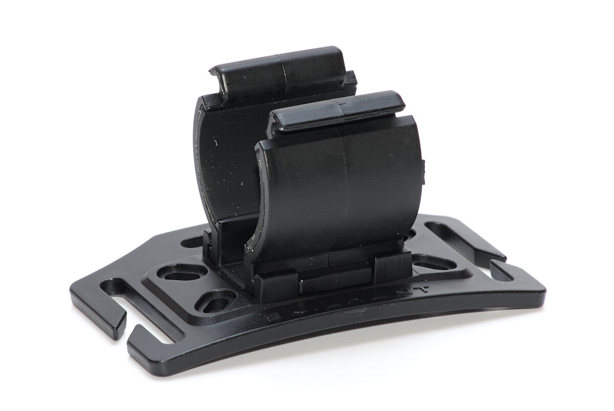 Durch die leicht gewölbte Form schmiegt sich die Halterung der Stirn an. Die Schlitze für das Band haben eine Breite von einem Zoll und sind somit kompatibel mit MOLLE/PALS. Im Vergleich zu früheren Exemplaren fühlt sich der Kunststoff etwas weicher an.