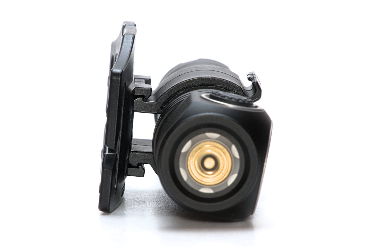 Dank einer Aussparung hinter der Lampe kann der Clip während der Nutzung mit dem Kopfband montiert bleiben. Ein optionaler O-Ring ermöglicht eine zusätzliche Sicherung der Lampe gegen Herausfallen, ist in der Praxis jedoch normalerweise nicht erforderlich.