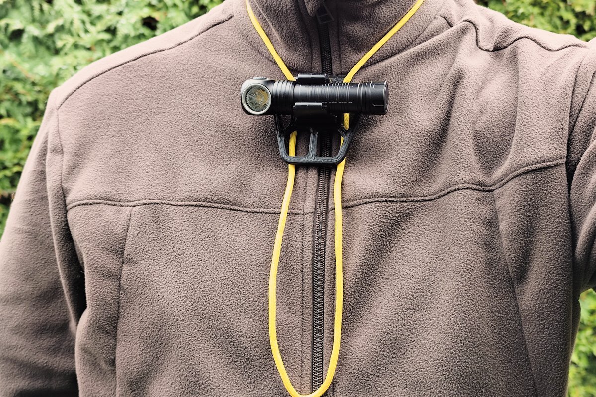 Beim Gehen bevorzuge ich mittlerweile eine leicht abgewandelte Tragweise: Statt sie am Kopf zu tragen, hänge ich mir die Lampe um den Hals. Dies reduziert die Eigenblendung bei Regen oder Schnee und sorgt auch dafür, dass andere Personen weniger geblendet werden, wenn man in ihre Richtung schaut. Zwar funktioniert die Methode auch mit der normalen Kopfhalterung, für mehr Komfort habe ich mir allerdings eine spezielle Halterung konstruiert.