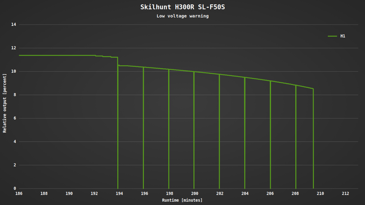 Ab der mittleren Stufe ist die Helligkeit über die gesamte Laufzeit konstant. Am Ende ist die Akkuwarnung zu sehen, die sich durch ein kurzes Blinken alle zwei Minuten bemerkbar macht. Diese Funktion wurde für den Test der TIR-Version deaktiviert.