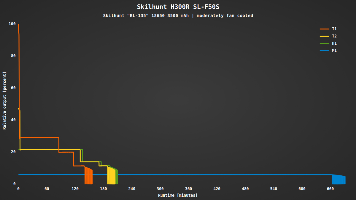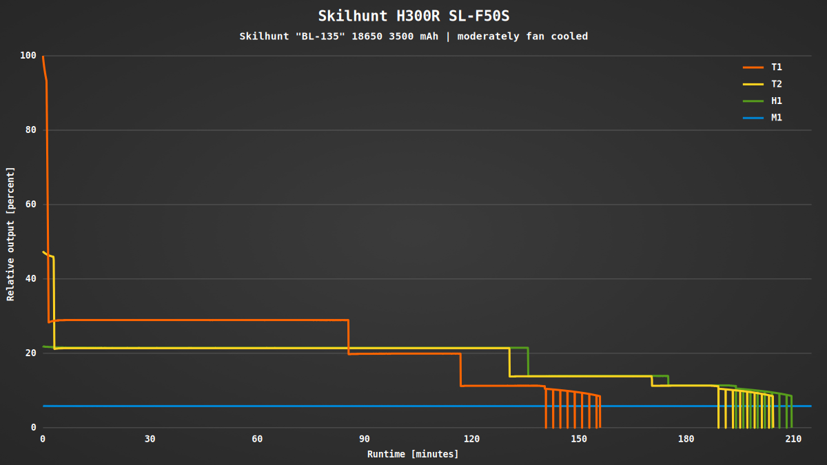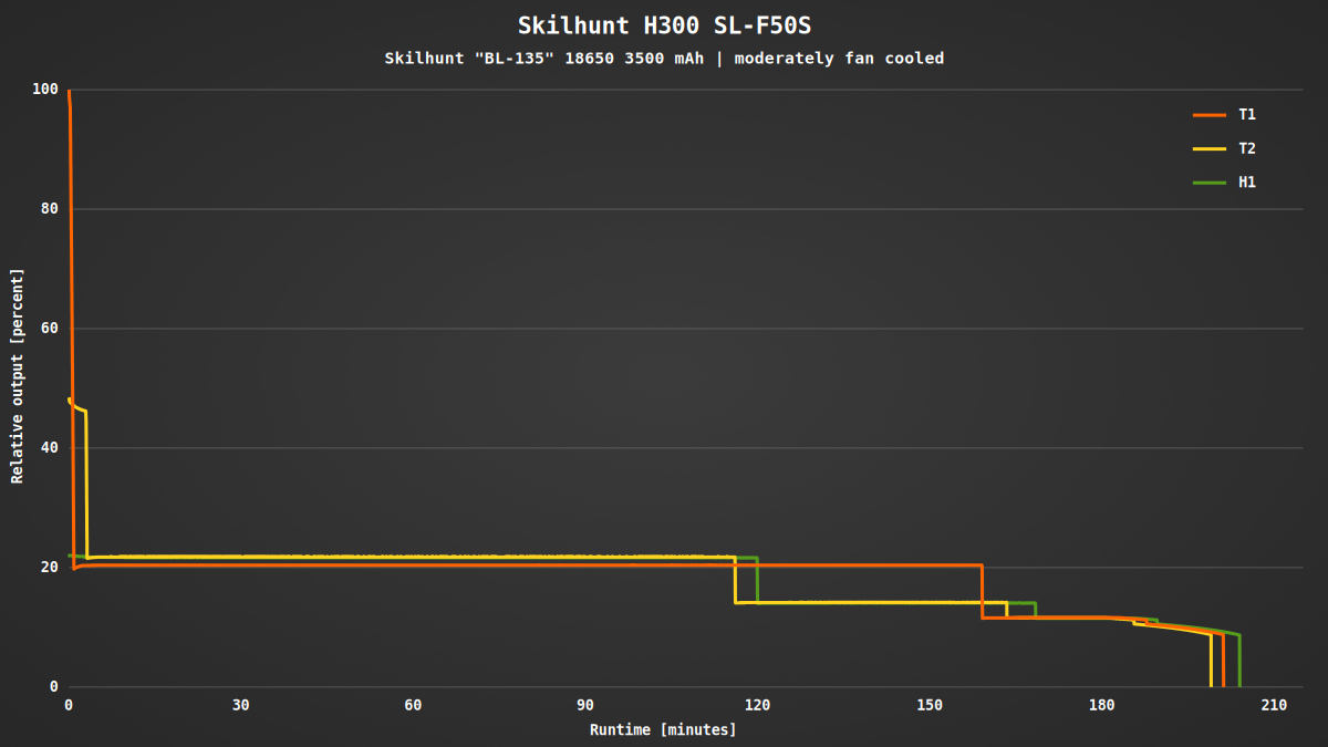 Die H300 verwendet einen Boost-Treiber, bei dem die LED mit einer höheren Spannung betrieben wird, als vom Akku bereitgestellt wird. Dadurch ist eine überwiegend konstante Helligkeit möglich.