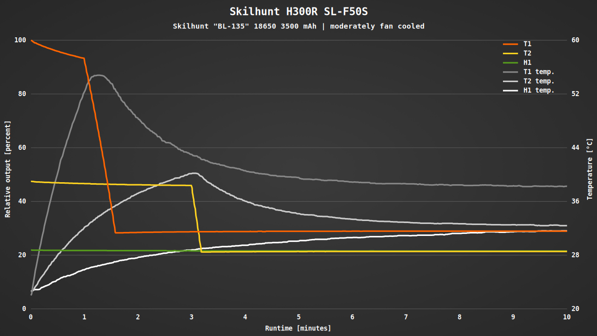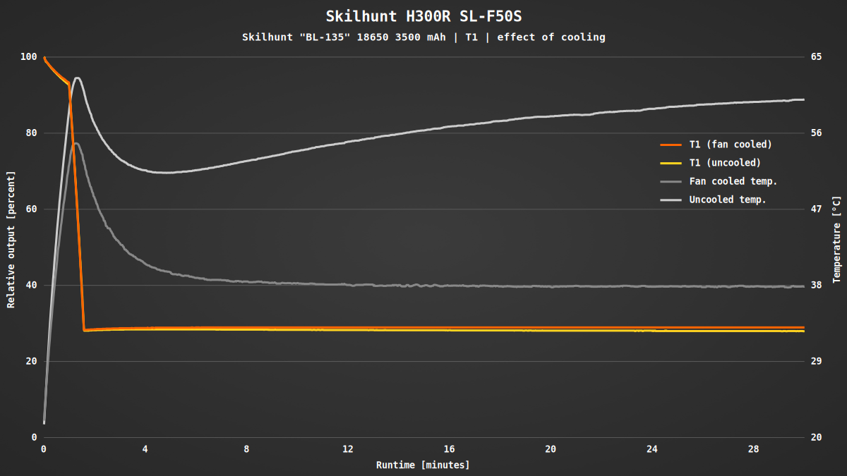 Der Vergleich zwischen gekühltem und ungekühltem Test zeigt deutlich, dass der Stepdown nicht temperaturabhängig erfolgt, sondern nach einer fest definierten Zeit. Ohne Kühlung werden kurzzeitig sogar 60 °C überschritten. Die höchste Stufe sollte also nicht mehrfach hintereinander aktiviert werden, damit die Lampe nicht zu heiß wird.