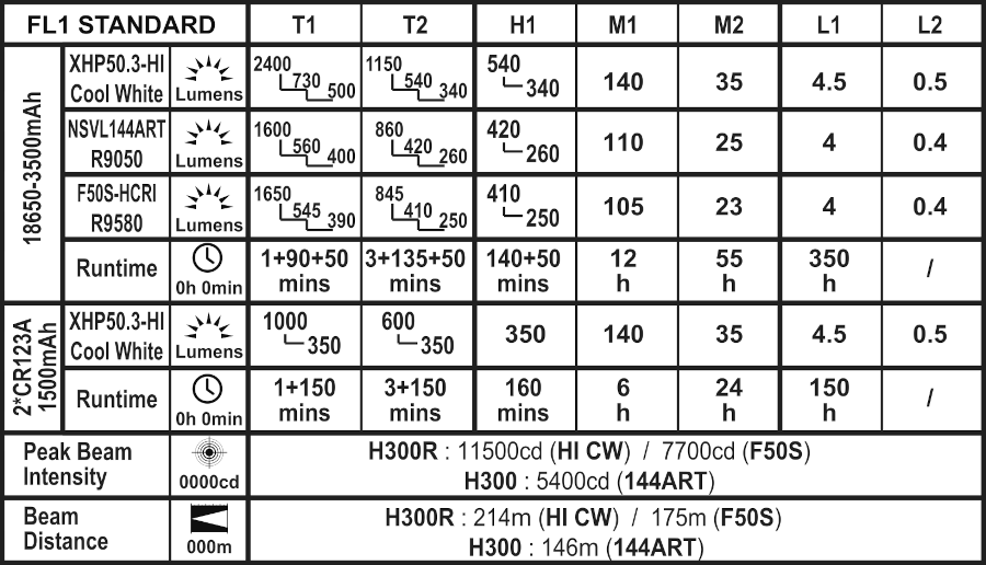 Bisher wurde die H300 in zwei Varianten angeboten: Zum einen mit der Cree XHP50.3 HI, welche die höchste Helligkeit und Reichweite bietet, allerdings auf Kosten der Lichtqualität (kaltweißes Licht mit geringer Farbwiedergabe). Zum anderen mit einer Nichia 144ART, die mit 4500 K nicht nur deutlich wärmer ist, sondern zugleich eine deutlich bessere Farbwiedergabe aufweist.