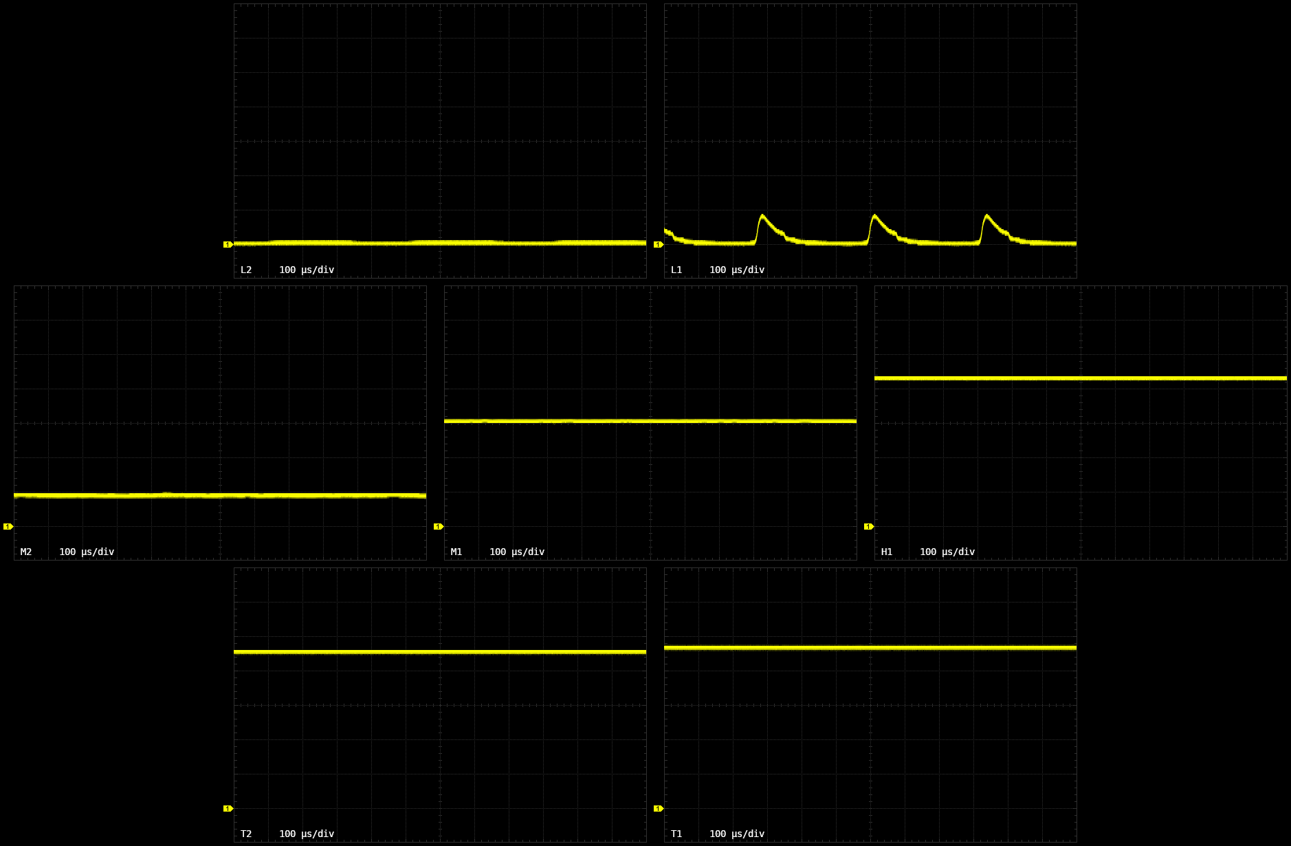 Fast alle Stufen werden vom Konstantstromtreiber ohne PWM geregelt. Lediglich in L1 und L2 lassen sich mit dem Oszilloskop kurze Pulse mit einer Frequenz von etwa 2 – 3 kHz feststellen, die für das Auge in der Regel nicht wahrnehmbar sind.