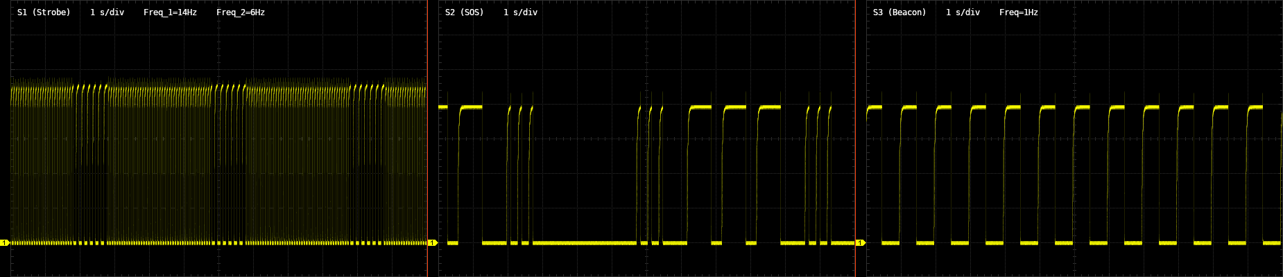 In der Strobe-Gruppe gibt es neben dem Strobe mit abwechselnd 6 und 14 Hz auch ein „SOS“ (eher ein „S-O-S“) sowie ein langsames Blinken mit 1 Hz. Ein Beacon mit einem kurzen Blitzen und einer Periode von zwei Sekunden, wie er bei einigen früheren Modellen zu finden war, ist leider nicht mehr vorhanden.