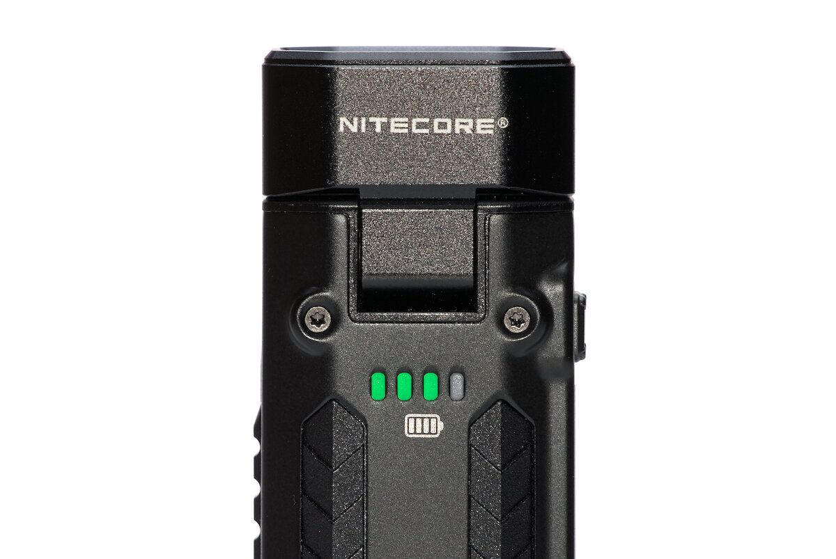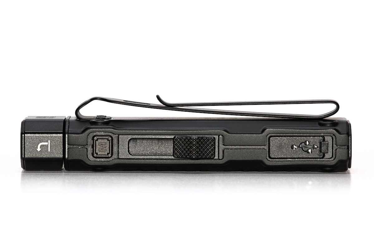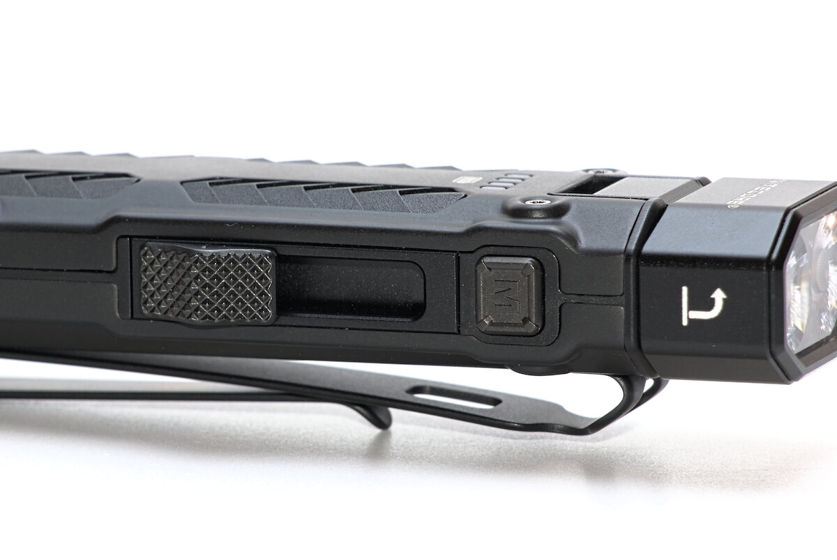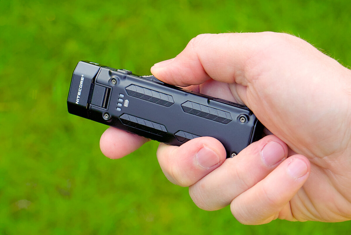 Auf der rechten Seite befinden sich ein Schiebeschalter und ein Taster, die in identisch Form bereits bei der kürzlich erschienenen Nitecore EDC17 zum Einsatz kamen.