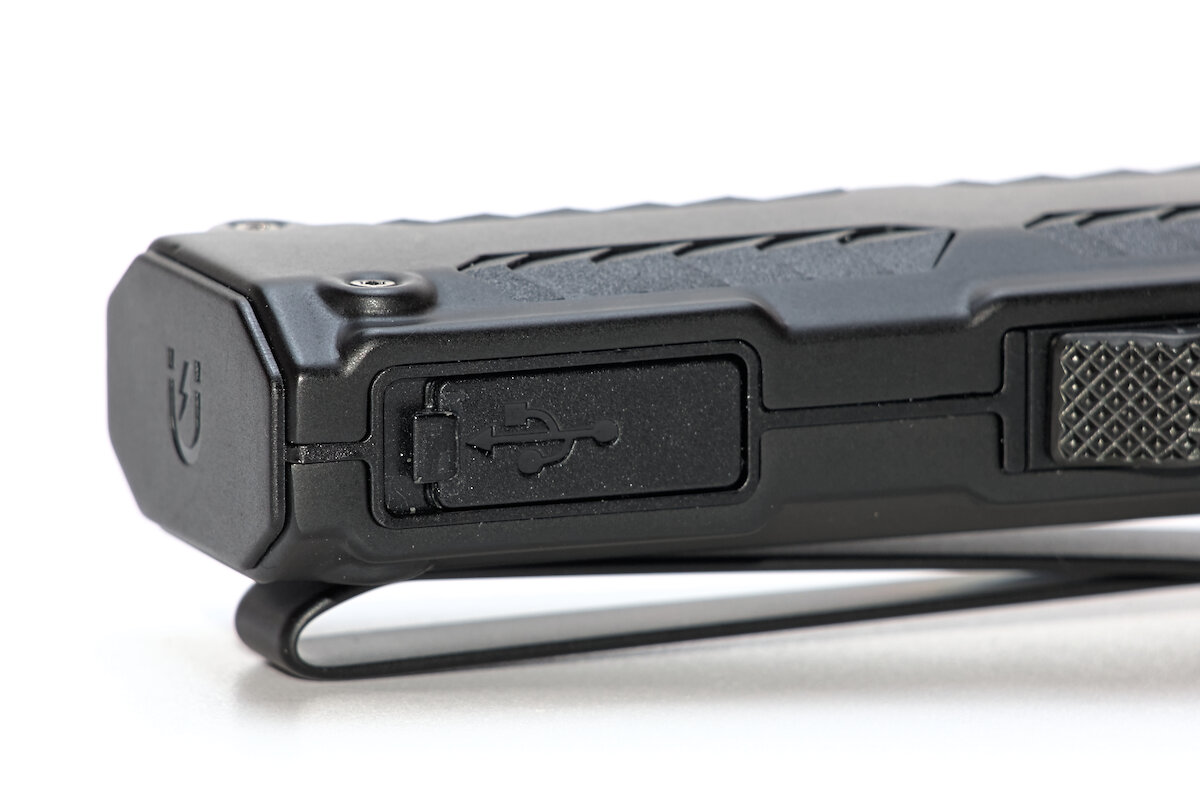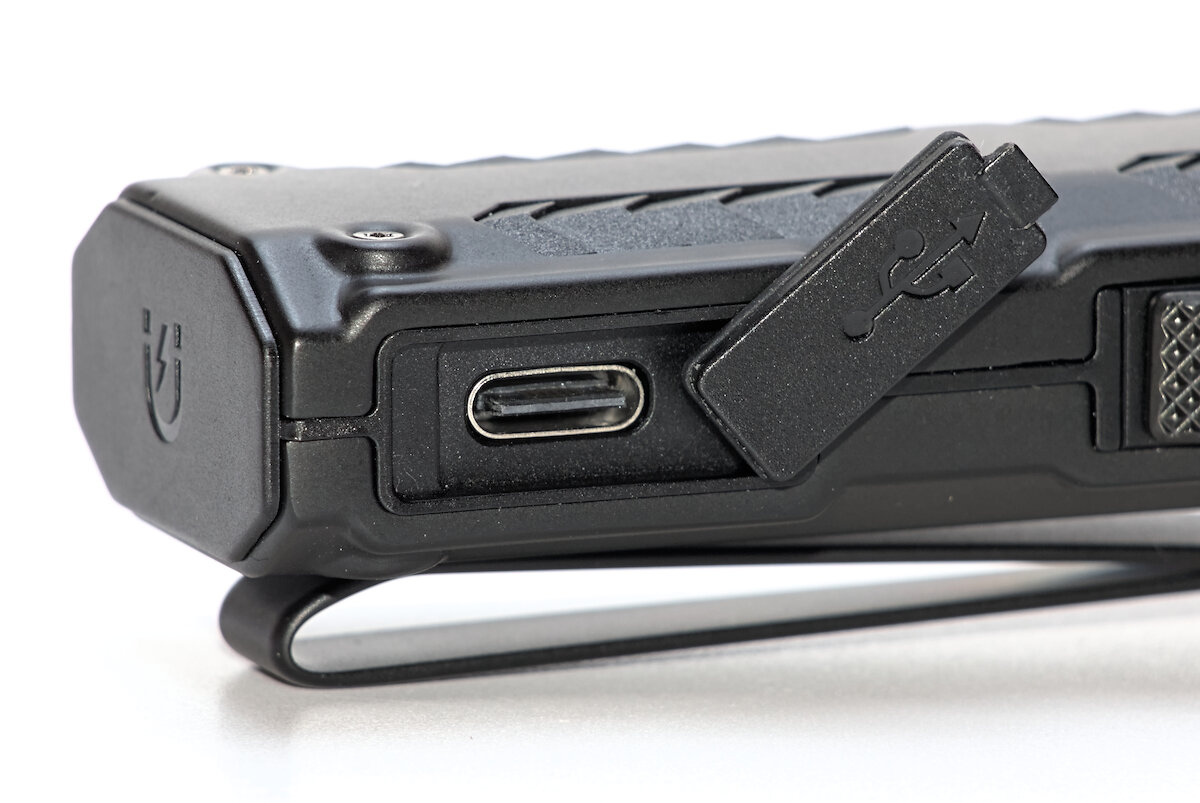 Das Aufladen der Taschenlampe erfolgt über einen USB-C Anschluss. Eine Abdeckung schützt ihn gegen Schmutz und Wasser. Die Außenseite besteht aus festem Kunststoff, die innere Hälfte hingegen aus Silikon. Dadurch dichtet die Abdeckung gut ab, lässt sich aber auch angenehm öffnen und schließen.