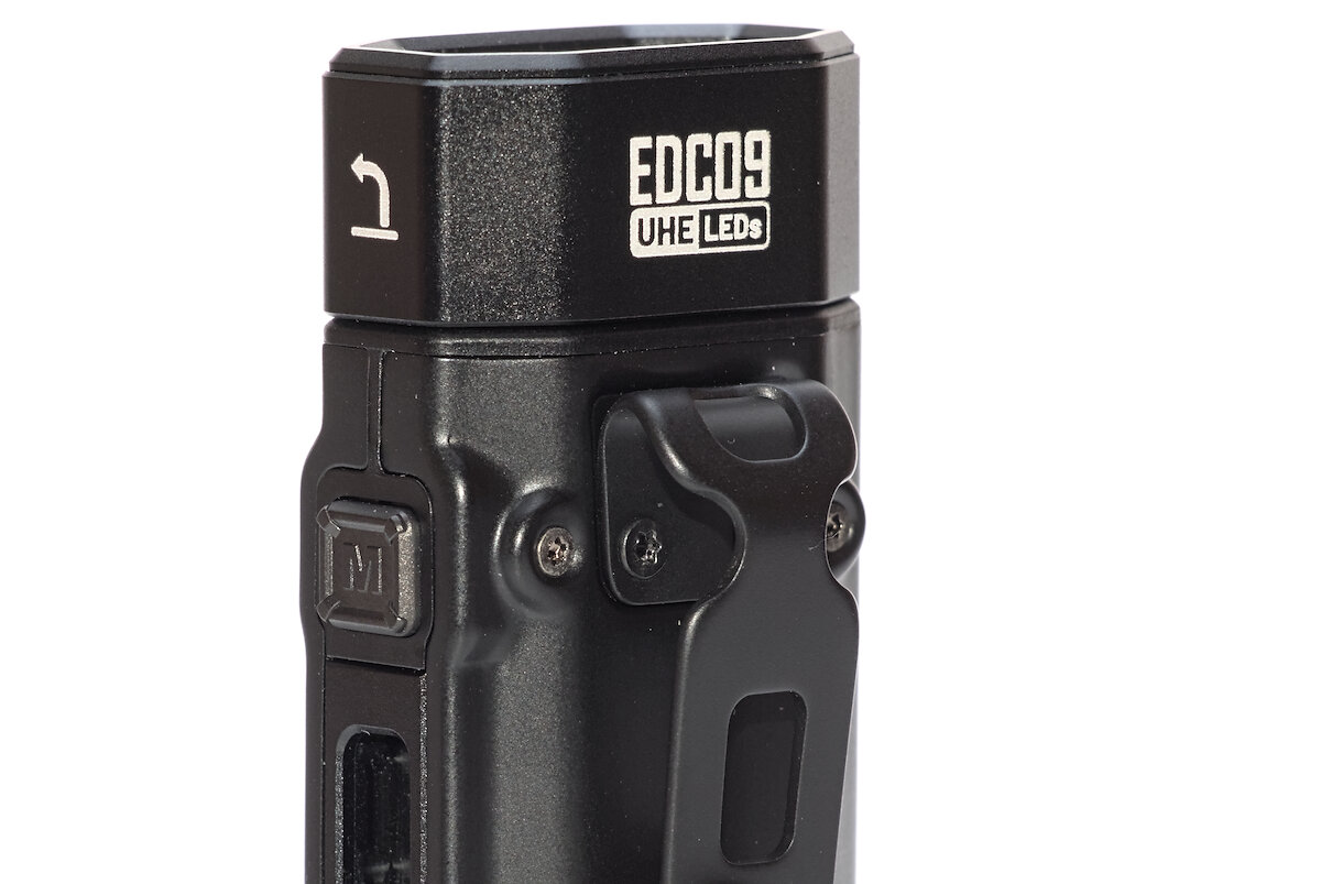 Wie schon der Name verrät, handelt es sich bei der EDC09 um eine „Every Day Carry“-Lampe: Ein Begleiter für den Alltag, den man ständig dabei haben kann. Mit einer Größe von 108 × 30 × 17 mm verschwindet die Lampe unauffällig in der Tasche ohne zu stören. Durch den Schalter und die Griffleiste beträgt die maximale Breite 34 mm und mit dem Clip ist die Lampe bis zu 24 mm dick.