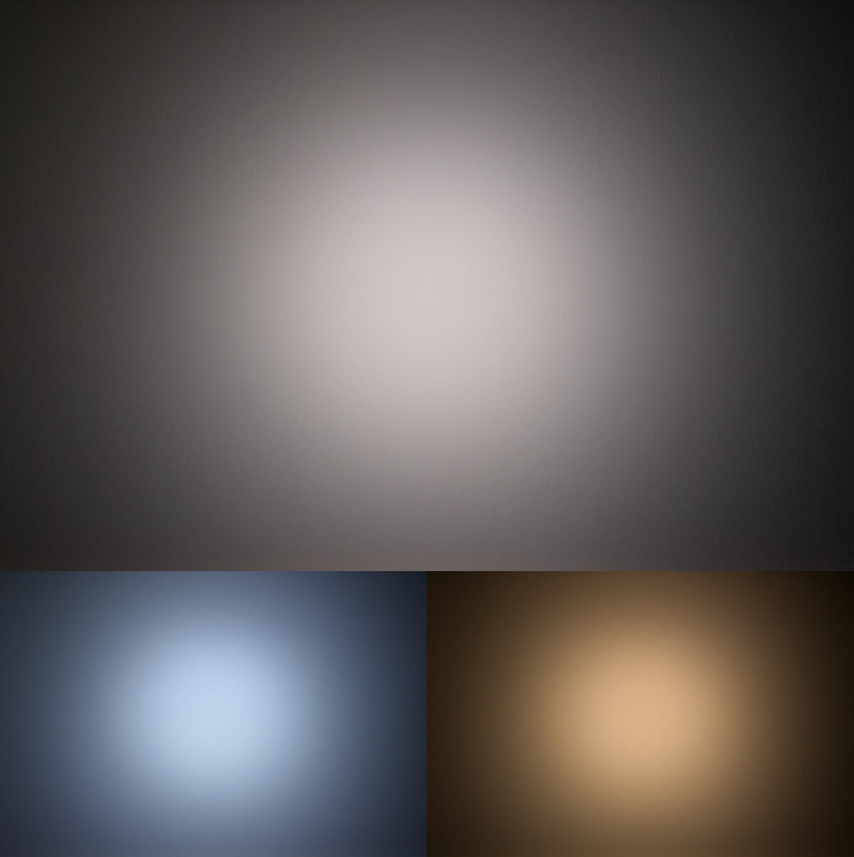 Das Lichtbild ist leicht flutig mit einem breiten Spot, der zum Rand hin sanft ausläuft. Die Lampe bietet eine angenehm gleichmäßige Ausleuchtung ohne Artefakte oder Farbverläufe. Die Färbung wirkt neutral, vielleicht sogar etwas rosig, auf jeden Fall nicht grün.