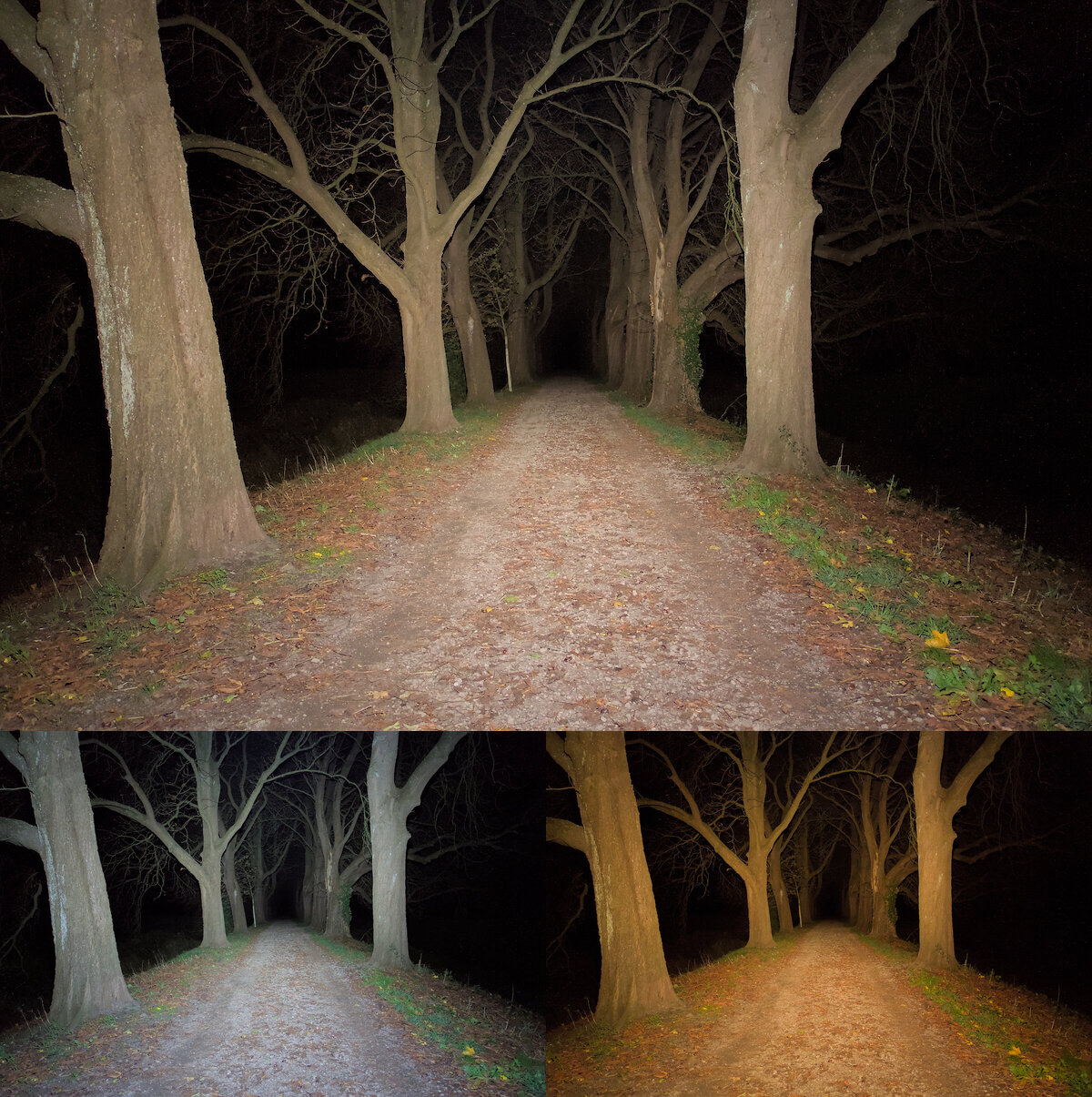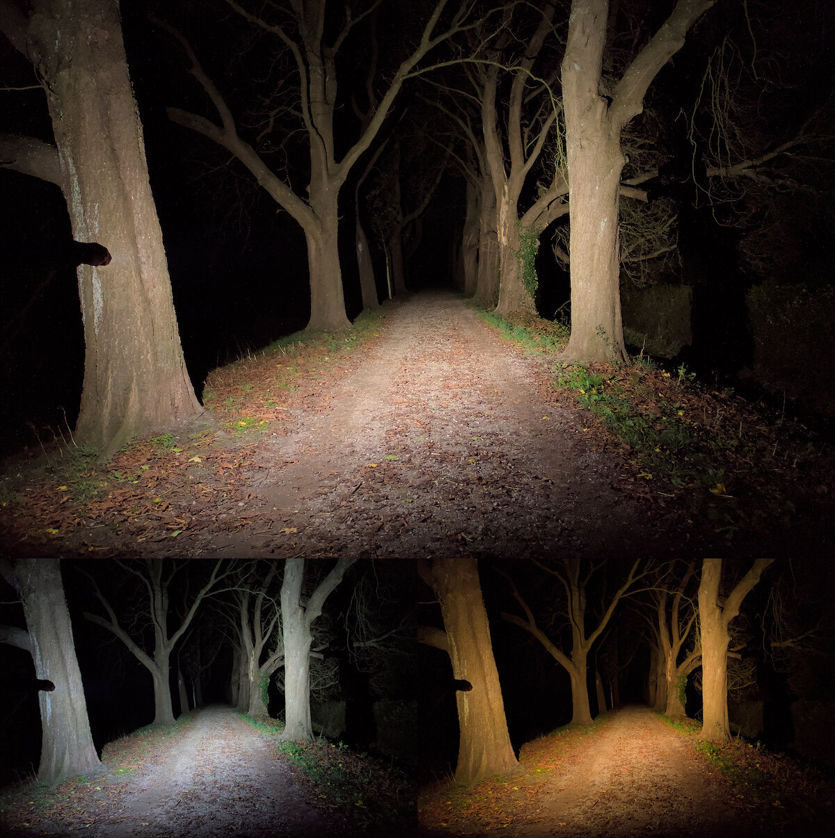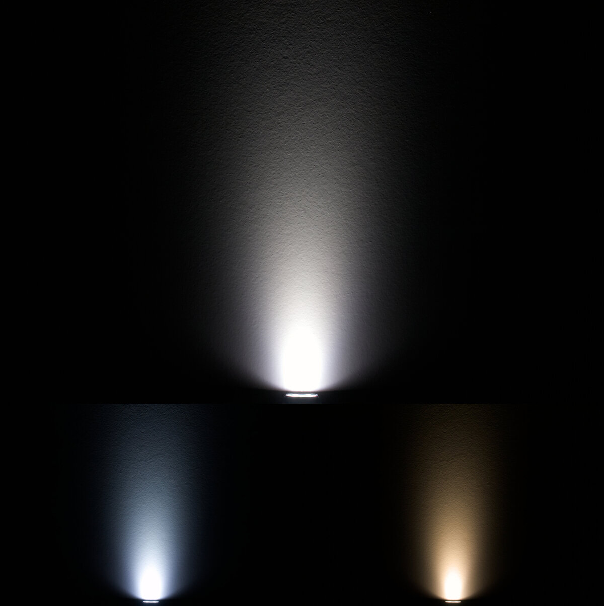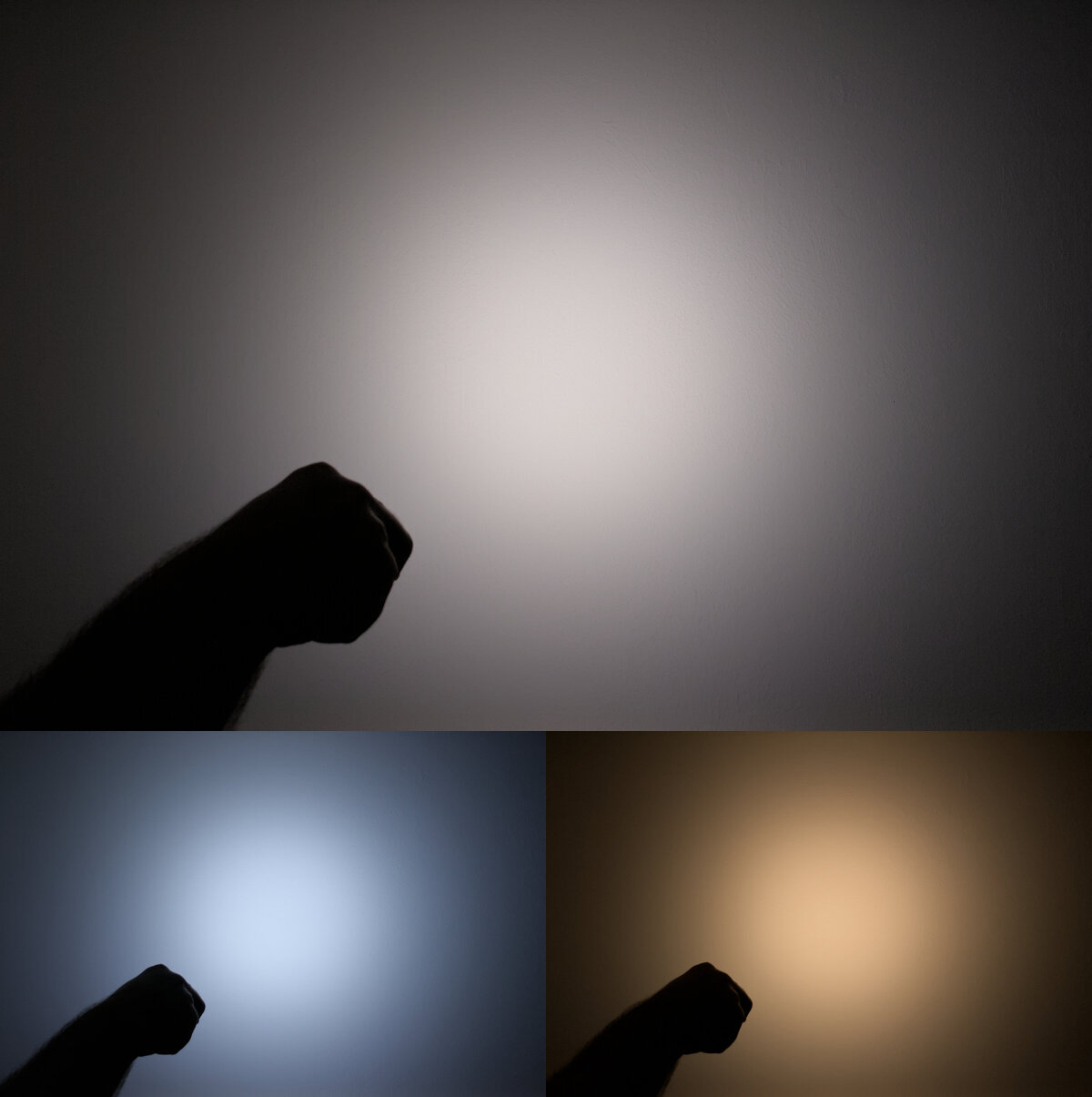 Bei den beiden LEDs handelt sich um eine Eigenentwicklung von Nitecore mit der Bezeichnung „MCT UHE“, was vermutlich für „Multiple Color Temperature with Ultra High Efficiency“ steht. Diese LEDs haben diagonal angeordnet je zwei warmweiße und zwei kaltweiße Leuchtflächen, die getrennt voneinander angesteuert werden können. Dadurch lässt sich die Farbtemperatur in drei Stufen von kaltweiß (6500 K, CRI 73) über Neutralweiß (4500 K, CRI 83) bis Warmweiß (3000 K, CRI 97) anpassen.