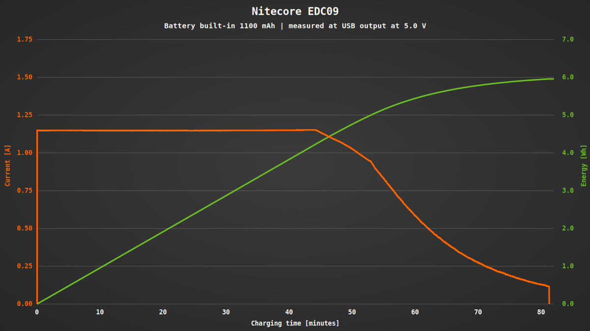 Der fest integrierte Akku mit 1100 mAh ist nach rund 80 Minuten vollständig aufgeladen. Ein spezielles Schnellladenetzteil ist dafür nicht erforderlich, da der Strom lediglich 1,2 A erreicht. Während des Ladevorgangs kann die Lampe ganz normal genutzt werden.
