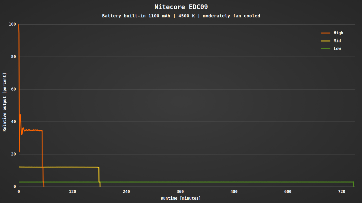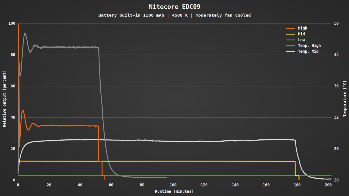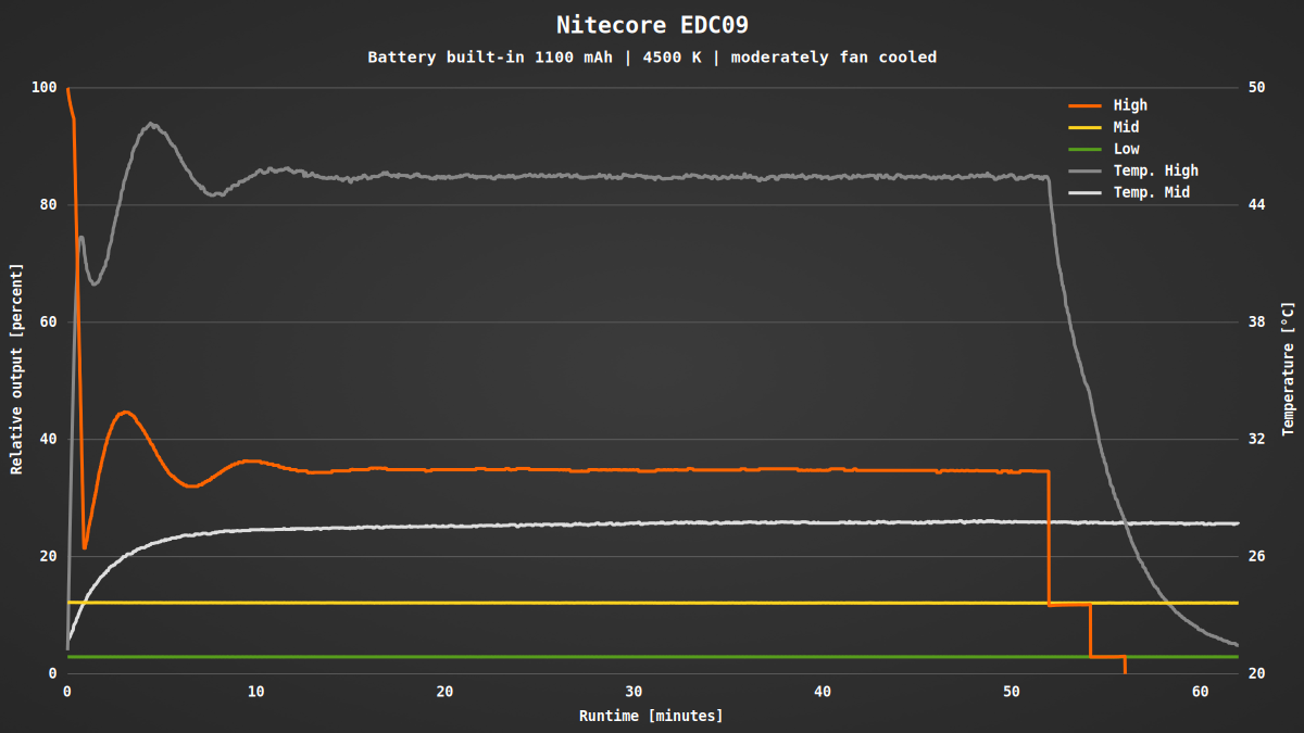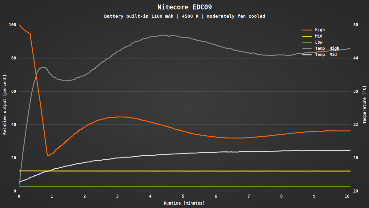 In der höchsten Stufe wird die Leistung nach etwa 20 Sekunden reduziert. Mit leichter Kühlung erreicht der Lampenkopf dabei eine Temperatur von rund 45 °C. Im Anschluss schwingt die Helligkeit für einige Minuten langsam auf und ab – ein Verhalten, das ich in ähnlicher Weise schon bei der EDC23 beobachten konnte. Ob dies eine Form der Temperaturregelung darstellt oder auf eine Reaktion des Reglers auf die Wärme zurückzuführen ist, kann ich nicht sagen.