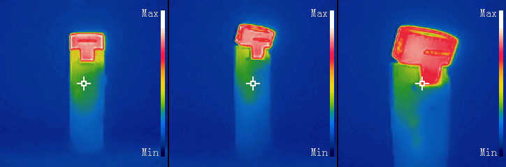 Im Wärmebild ist deutlich zu erkennen, welche Nachteile der bewegliche Kopf für das Wärmemanagement hat. Durch das Gelenk wird die Wärme kaum vom Kopf an die restliche Lampe übertragen. Einerseits lässt sich die Lampe dadurch angenehmer halten, andererseits sorgen die geringe Masse und Oberfläche des Kopfes dafür, dass sich die Lampe schneller erwärmt.