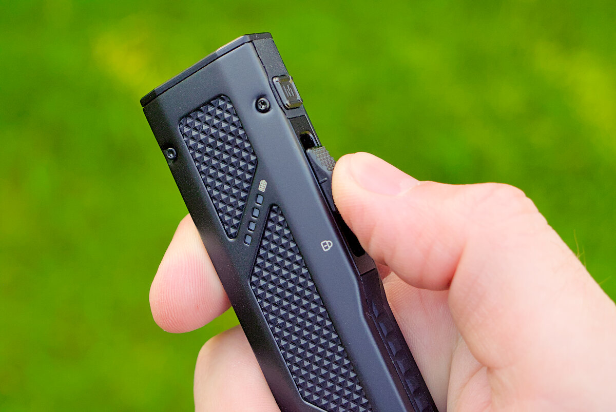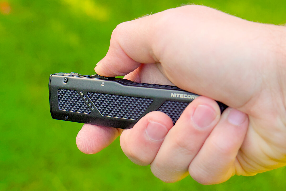 Da das Design an ein Taschenmesser angelehnt und von Anfang an auf ergonomische Handhabung ausgelegt wurde, überrascht es nicht, dass die Lampe angenehm in der Hand liegt. Der Schalter liegt genau an der richtigen Stelle, um ihn mit dem Daumen bequem zu bedienen.