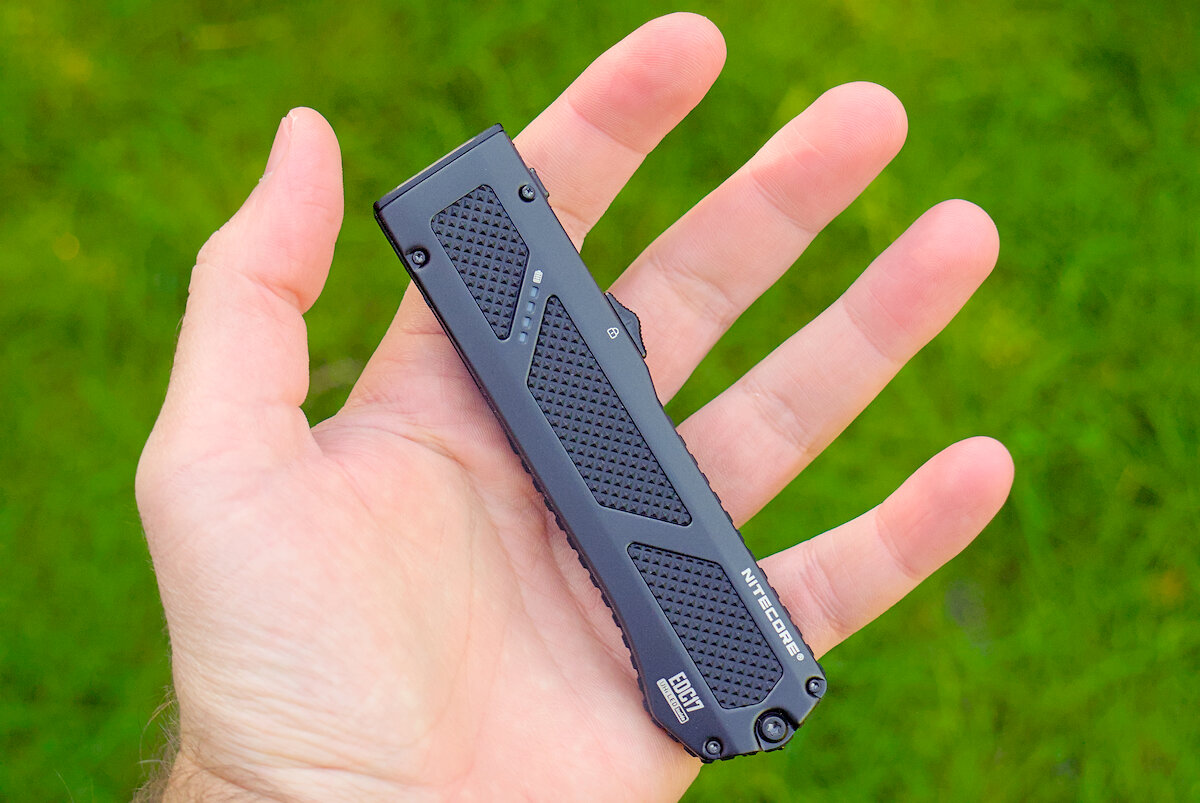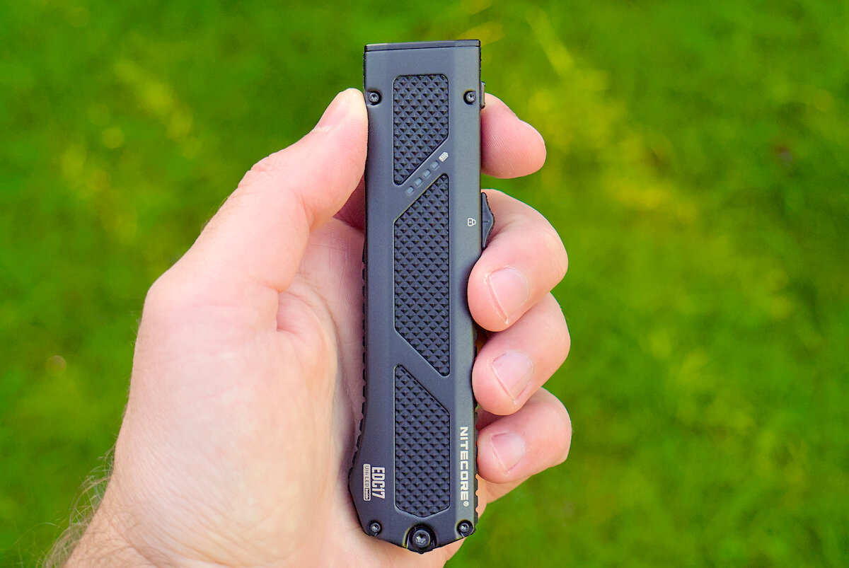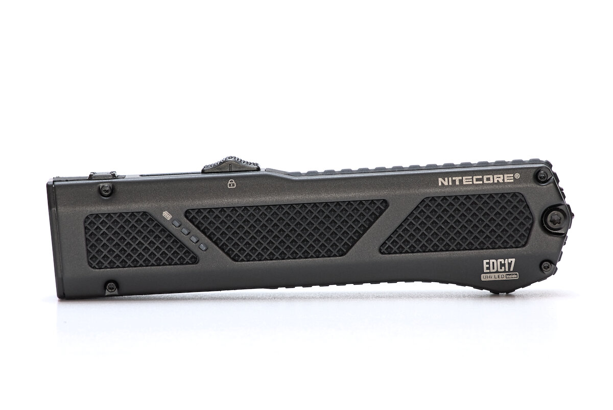 Lässt man das Design ein wenig auf sich wirken, dürfte die Ähnlichkeit zu einer ganz bestimmten Gattung von Taschenmessern deutlich werden. Bei diesen OTF-Messern („Out the Front”) wird durch das Schieben des Schalters ein Federmechanismus gespannt und ausgelöst, wodurch die Klinge vorne herausspringt. Bei der EDC17 kommt natürlich keine Klinge heraus, sondern Licht.