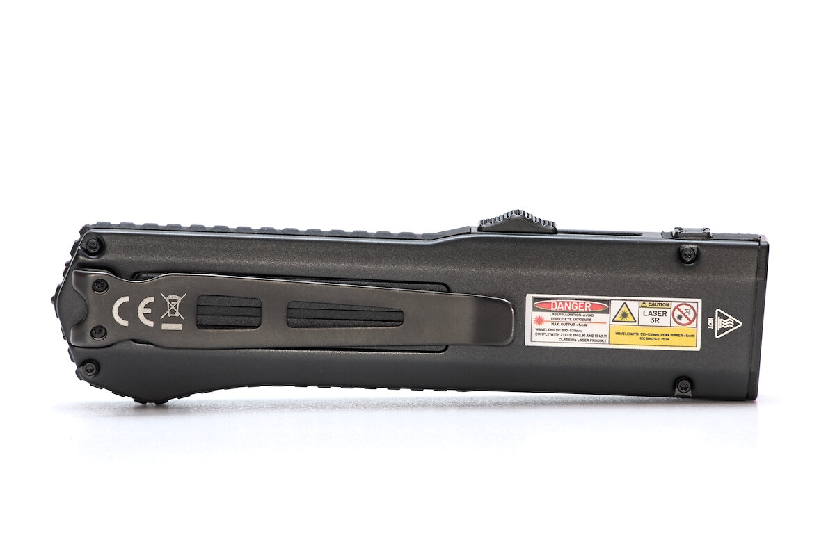 Auf der Rückseite befindet sich ein Aufkleber mit Hinweisen zur Laserklasse, der sich problemlos rückstandsfrei entfernen lässt. Hinter dem Clip ist der Kühlkörper sichtbar, über den im Betrieb ein Teil der Wärme abgeführt wird. Durch den Clip wird ein direkten Kontakt vermieden, um somit vor möglichen Verbrennungen zu schützen.