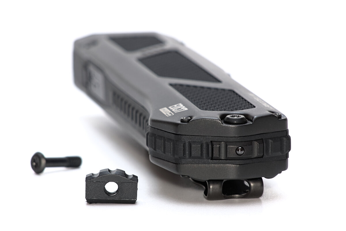 Am hinteren Ende der Lampe ist ein Glasbrecher integriert. Wer keinen Bedarf daran hat, kann ihn problemlos durch einen Einsatz ohne Siliziumnitrid-Kugel ersetzen (es wird ein T9-Schraubendreher benötigt). Wirklich nötig ist das jedoch nicht, da der Glasbrecher sehr dezent gehalten ist und nicht weiter stört. Die Konstruktion mit wechselbarem Einsatz hat allerdings zur Folge, dass der Einsatz leicht klappern kann. Ein Problem, das sich durch ein winziges Stück Schaumstoff leicht beheben ließ.