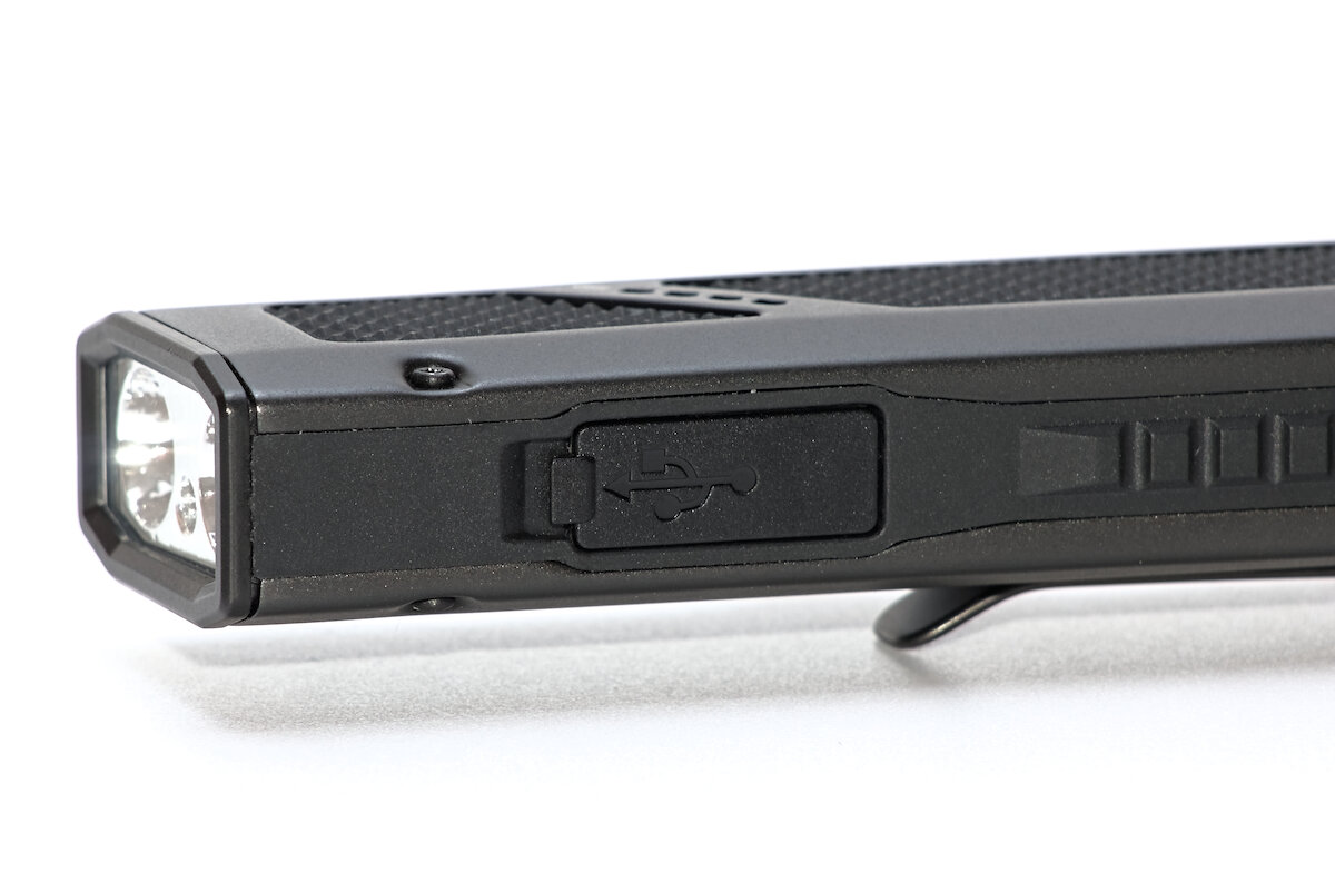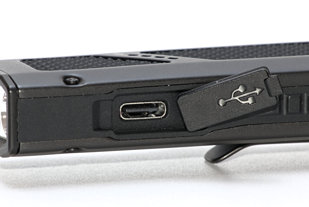 Das Aufladen der Taschenlampe erfolgt über einen USB-C Anschluss. Eine Abdeckung schützt gegen Schmutz und Wasser. Ihre Außenseite besteht aus festem Kunststoff, die innere Hälfte hingegen aus Silikon. Dadurch dichtet sie gut ab, lässt sich aber auch angenehm öffnen und schließen.