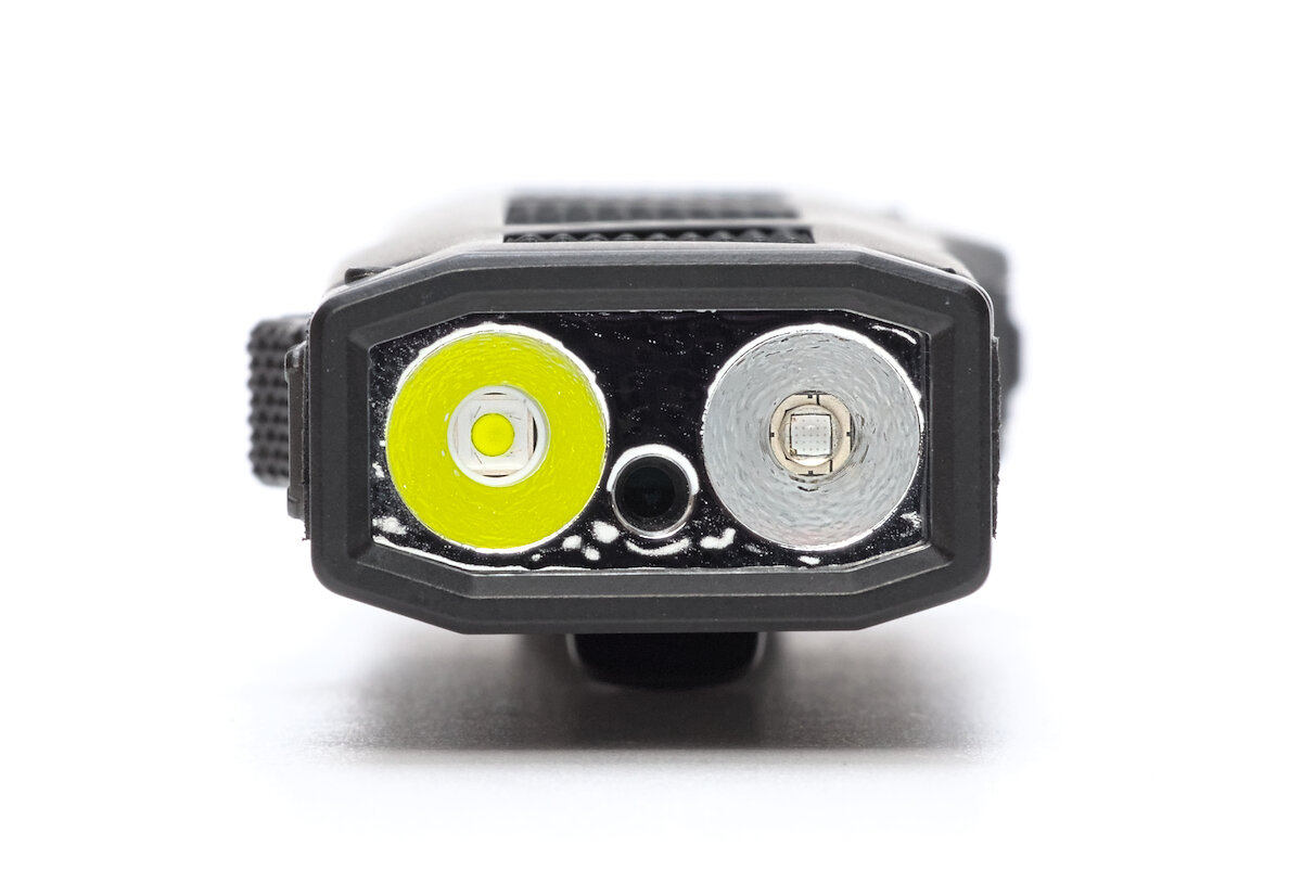 Ein seitlich angebrachter Schiebeschalter ermöglicht eine besonders intuitive Bedienung der Lampe. Mit einem satten Klicken rastet er präzise in vier Positionen ein. Weiter vorne befindet sich eine Taste, mit der sich über einen kurzen Druck zwischen den drei Lichtkanälen – Weiß, Laser und UV – wechseln lässt. Beide Tasten bestehen aus Kunststoff, machen aber einen hochwertigen Eindruck.