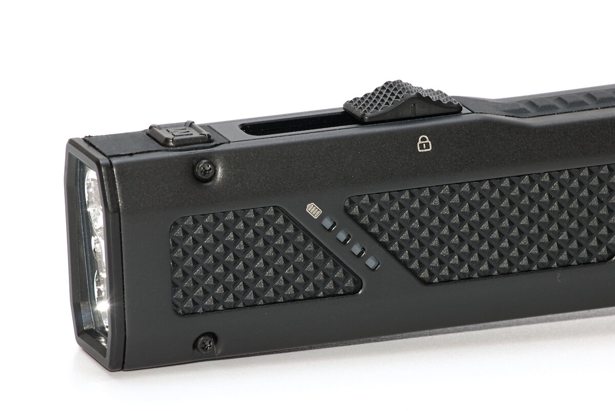 Mit dem Schiebeschalter wird die Lampe eingeschaltet und die Helligkeit in drei Stufen verstellt (Low, Mid und High beim weißen Licht sowie Level 1 bis 3 beim UV-Licht). Wird beim Einschalten zusätzlich die Taste gedrückt gehalten, erhält man Zugriff auf einen zusätzlichen Ultralow-Modus für das weiße Licht.