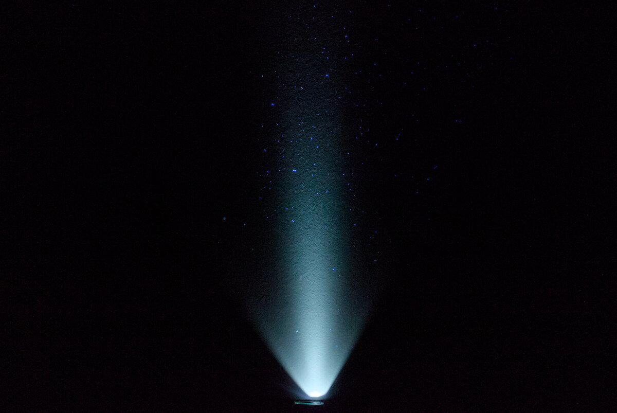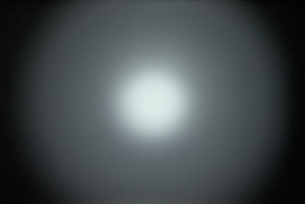 Der Spot des weißen Lichts ist recht kompakt und geht mit einem weichen Übergang in den Spill über. Die Farbtemperatur des kaltweißen Lichts schätze ich auf ungefähr 6000 K. Auf voller Helligkeit hat das Licht eine neutrale Färbung, bei niedriger Helligkeit zeigt sich ein leicht grünlicher Farbstich.