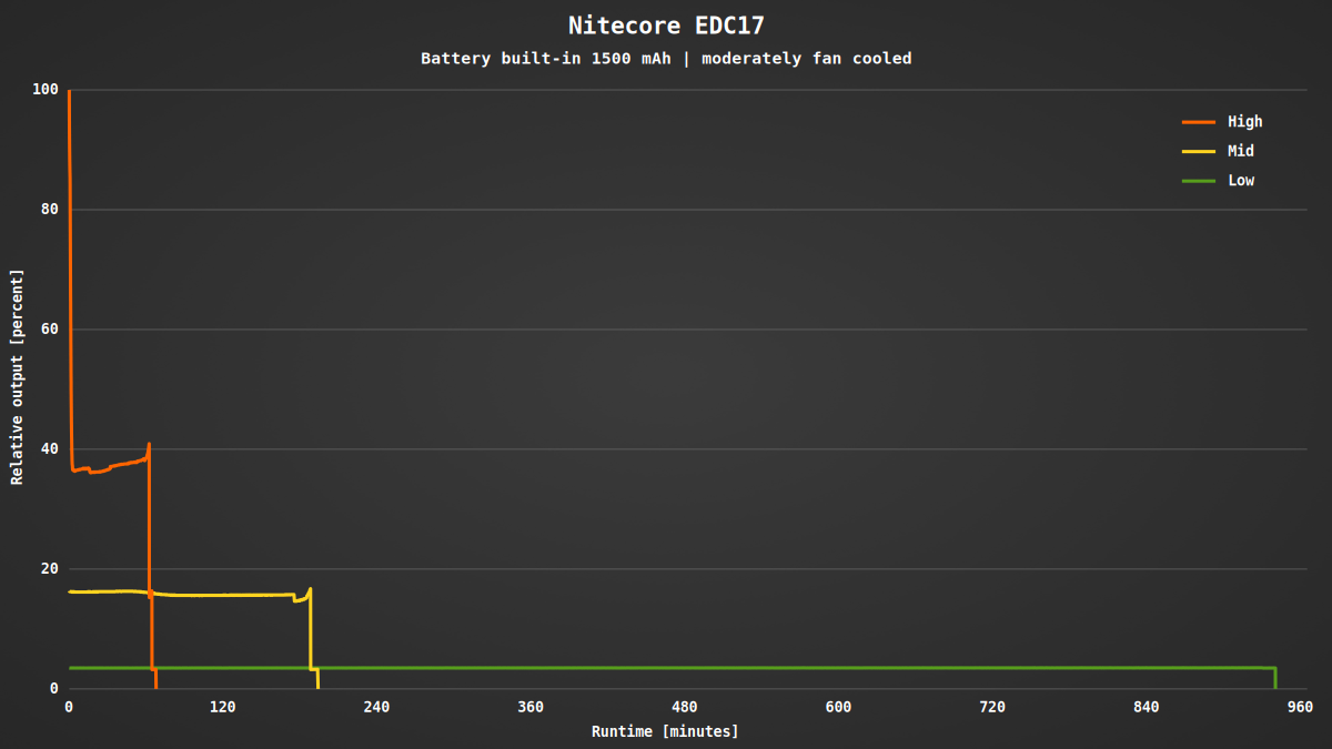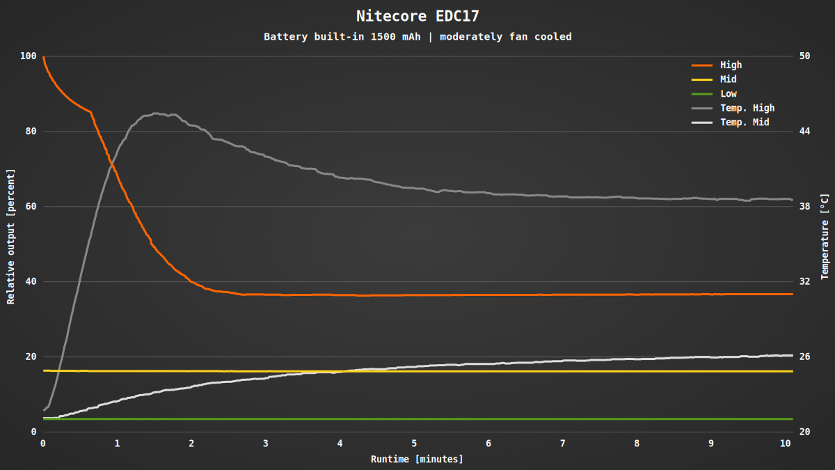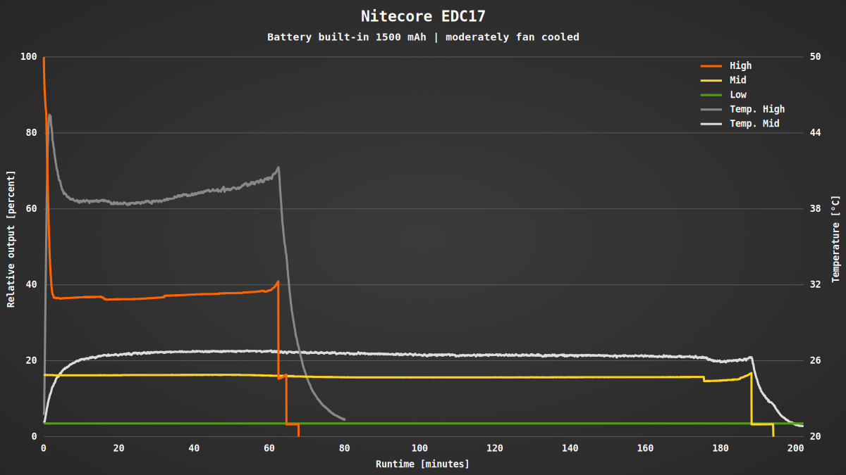 In den niedrigeren Stufen wird die Helligkeit über die gesamte Laufzeit schön konstant gehalten. Auch die Laufzeit passt recht gut mit den Herstellerangaben überein. Lediglich in der höchsten Stufe schaltet die Lampe deutlich früher ab, möglicherweise wegen der Kühlung und damit verbunden höherer Helligkeit.