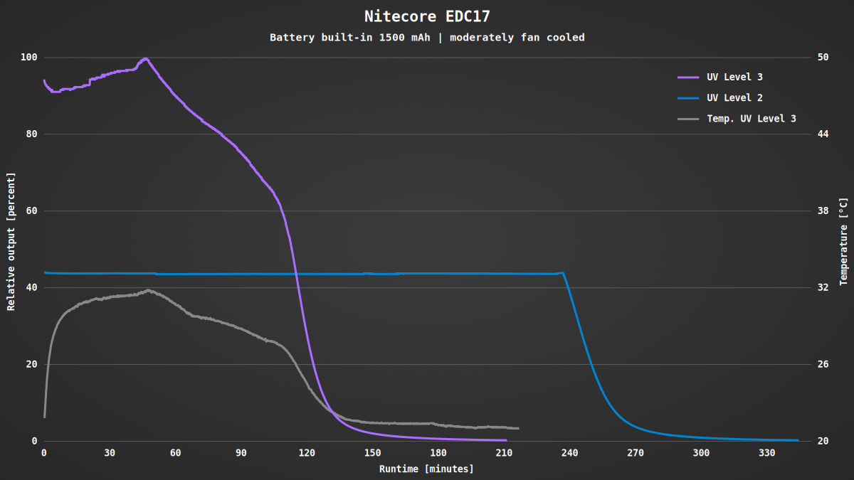 In der höchsten Stufe des UV-Lichts zeigt sich der Helligkeitsverlauf anfangs noch etwas ungleichmäßig und fällt anschließend relativ früh allmählich ab. Ursache dürfte die vergleichsweise hohe Vorwärtsspannung der UV-LED sein, die der Buck-Treiber bei sinkender Akkuspannung nicht mehr bereitstellen kann. Auf Stufe 2 wird die Helligkeit deutlich länger konstant gehalten.