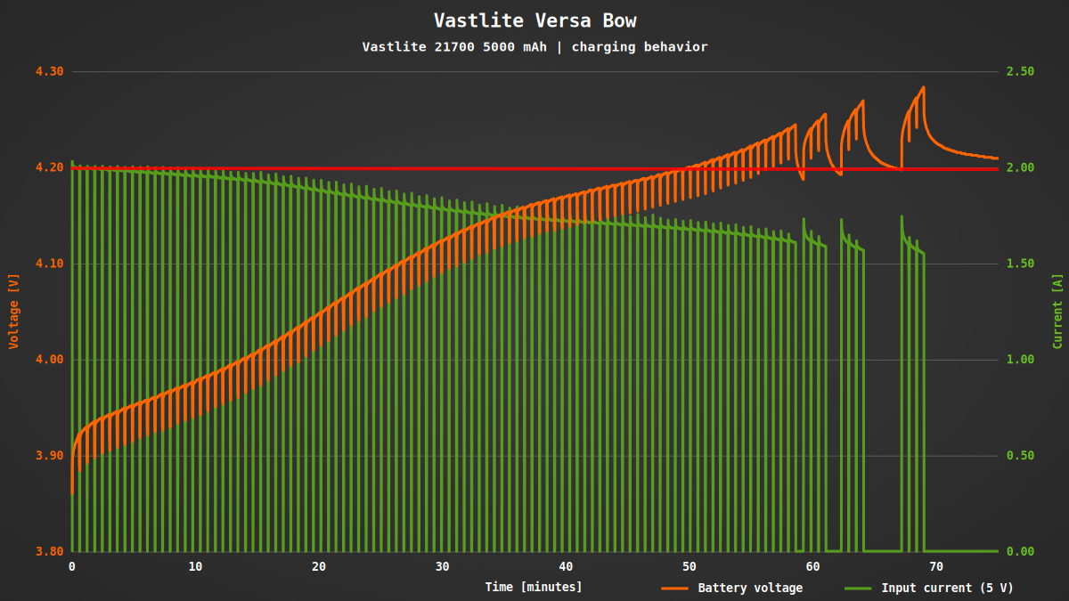 Laut Hersteller werden zwei LR5112 in Parallelschaltung verwendet, die laut Spezifikation geeignet sein sollten. Jedoch entsprechen meine Beobachtungen nicht der Beschreibung aus dem Datenblatt, sodass möglicherweise ein Fehler bei der Implementierung vorliegt. Die Akkuspannung sollte 4,20 V nicht überschreiten. Zudem wird der Ladevorgang am Ende mehrfach neu gestartet (die Status-LED leuchtet dazwischen grün). Unterbrechungen des Ladevorgangs sind weder sinnvoll noch für den Laderegler vorgesehen.