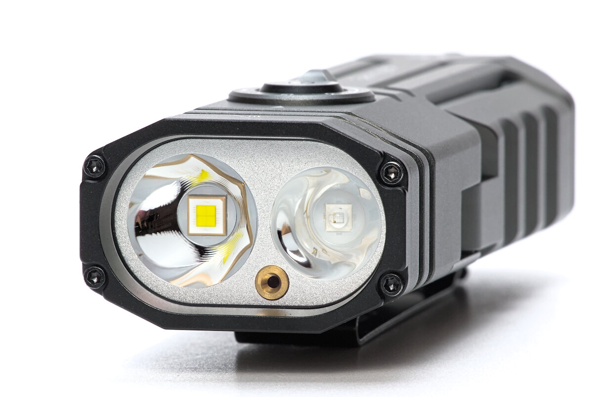 Auf der Vorderseite befinden sich hinter einer Glasscheibe mit magentafarbener Antireflexbeschichtung eine kaltweiße Luminus SFT-70 Gen 2 für das Spotlicht, eine Luminus SST-08-UV mit 365 nm sowie ein grüner Laser mit einer spezifizierten Leistung von ≤ 5 mW.