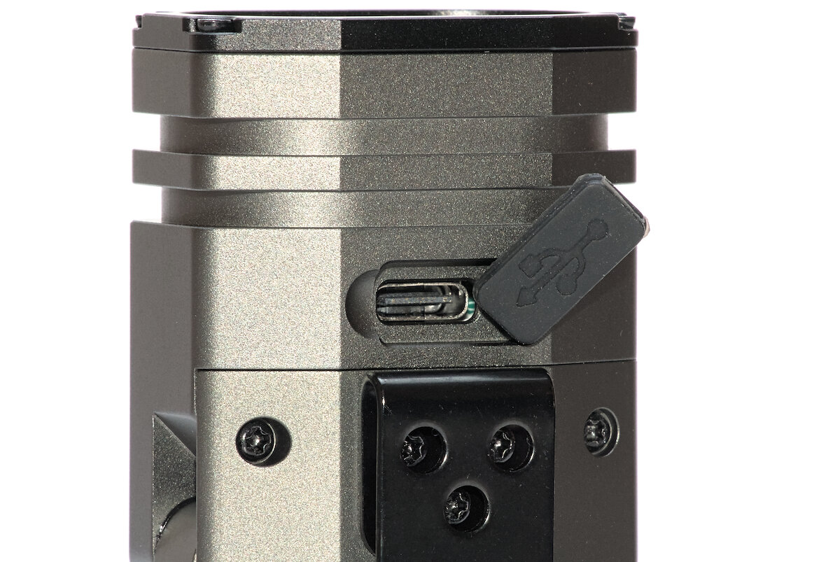 Über einen USB-C-Anschluss auf der Rückseite lässt sich der Akku direkt in der Lampe laden. Eine flach anliegende Silikonabdeckung schützt ihn vor Wasser und Schmutz. Zur leichteren Öffnung gibt es keine Lasche, sondern eine kleine Nagelkerbe. Mir gefällt dieses Design, da sich die Abdeckung auf diese Weise nicht so leicht versehentlich öffnet.