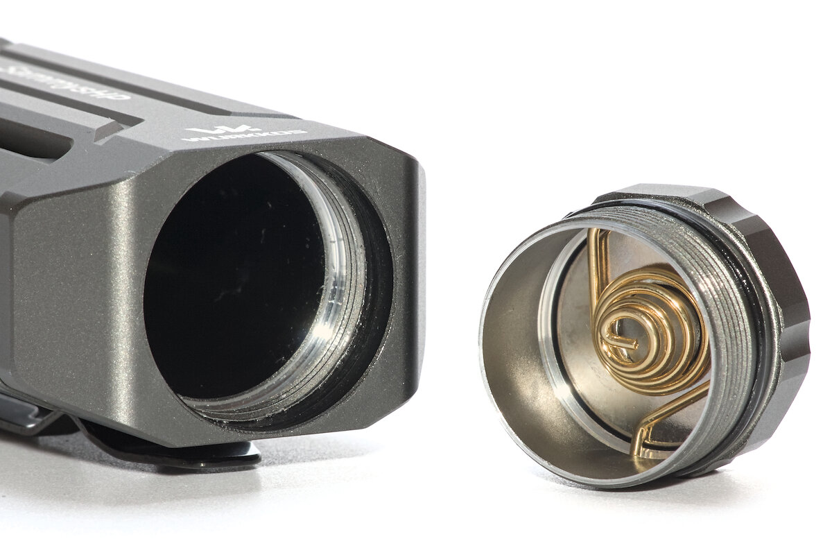 Kräftige Federn auf beiden Seiten stellen den Kontakt zum Akku her. Die Lampe ist für ungeschützte 21700-Akkus mit flachem Pluspol konstruiert. Button-top-Akkus passen gerade noch so hinein, doch für längere (geschützte) Akkus ist nicht genügend Platz vorhanden.