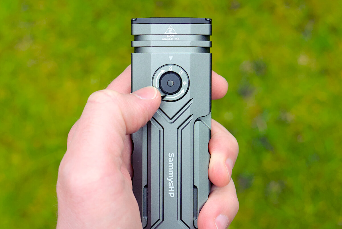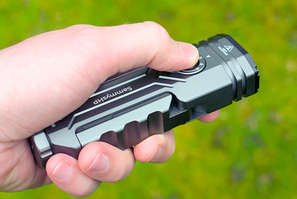 Die Lampe liegt zwar recht voluminös in der Hand, lässt sich jedoch trotzdem angenehm halten. Die breiten Kerben an den Flügeln bieten selbst bei feuchten Bedingungen eine gute Griffsicherheit. Auch im Dunkeln ist der Taster leicht zu finden und die Steuerung über den Drehschalter gelingt mühelos.