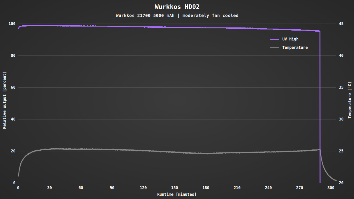 Auch das UV-Licht zeigt eine sehr konstante Regelung. Die volle Helligkeit wird fast fünf Stunden lang durchgehend gehalten und entspricht damit in etwa den Herstellerangaben. Die Erwärmung ist in diesem Fall zu vernachlässigen.