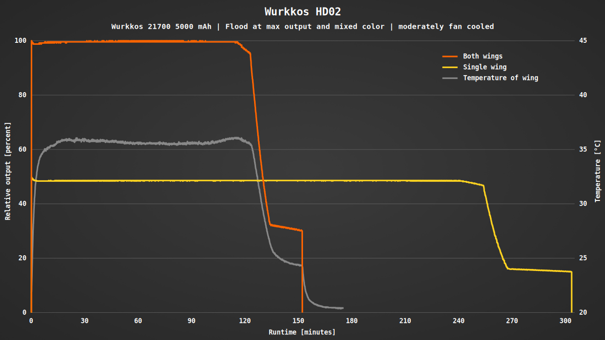Beim Flutlicht steht die maximale Helligkeit für fast die gesamte Laufzeit zur Verfügung. Werden beide Flügel genutzt, verdoppelt sich die Helligkeit, während sich die Laufzeit halbiert. Die Flügel erreichen bei voller Leistung eine Temperatur von 35 °C. Damit ist das Flutlicht gut für den Dauerbetrieb geeignet.