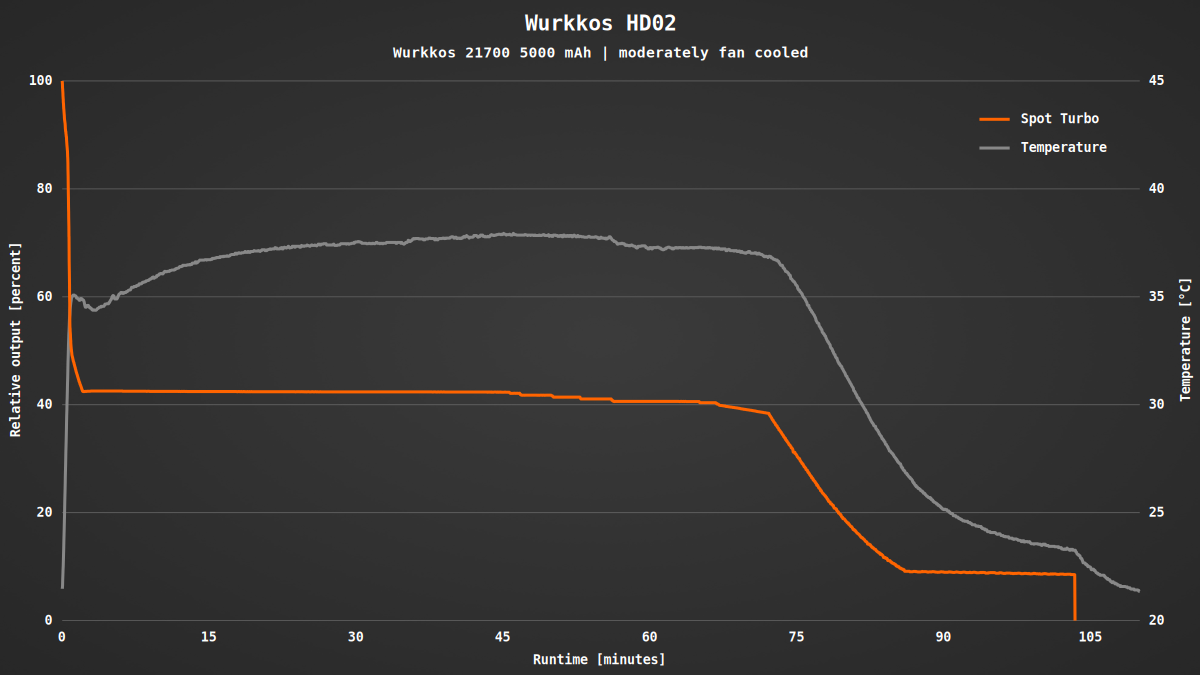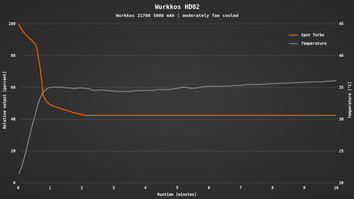 Da es keine festen Stufen gibt, habe ich die Laufzeit lediglich für die maximale Helligkeit gemessen. Beim Spot passen die Ergebnisse fast perfekt zu den Herstellerangaben. Wenn die Helligkeit nach knapp einer Minute automatisch reduziert wird, erreicht die Temperatur bei leichter Kühlung lediglich 35 °C und steigt auch im späteren Verlauf nur auf moderate 38 °C an.